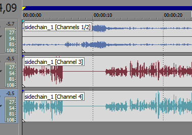这表明,在通道1/2中,我得到了压缩的背景,而在通道3和4中,我得到了两个不同的单声道(可能,这是原始的声音输入和一些改变的声音输入,都是单声道)。UPD:我不想在索尼维加斯进一步处理最终的赛道,我更希望ffmpeg是我生产过程中的最后一步。上面的屏幕截图仅用于说明。