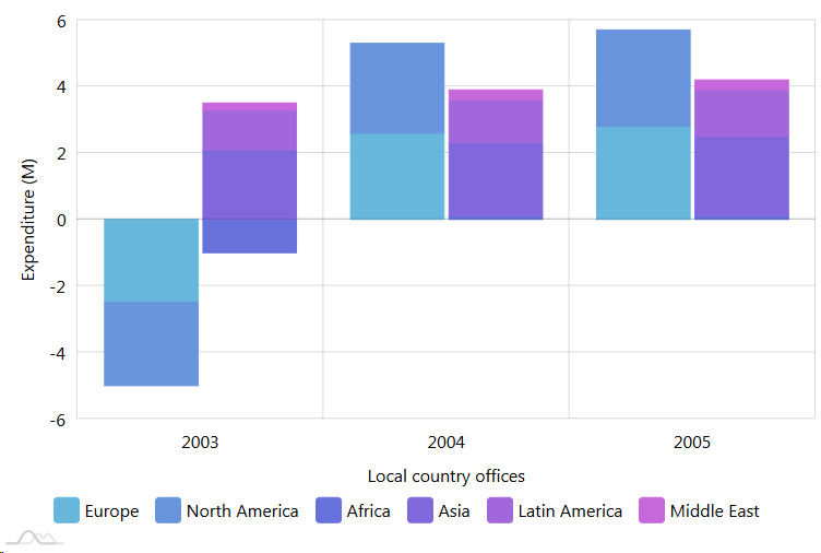 通过将序列的stacked属性设置为false,我们表示希望在该系列中开始另一组堆叠列。非洲系列是第二组中的第三个堆栈,但第一个对第一类(2003年)具有负值。我不确定这将如何显示,例如,当其他一切都是正数时,它的负值如何在堆栈中占据它的份额,特别是当它被叠加在正值之上时?