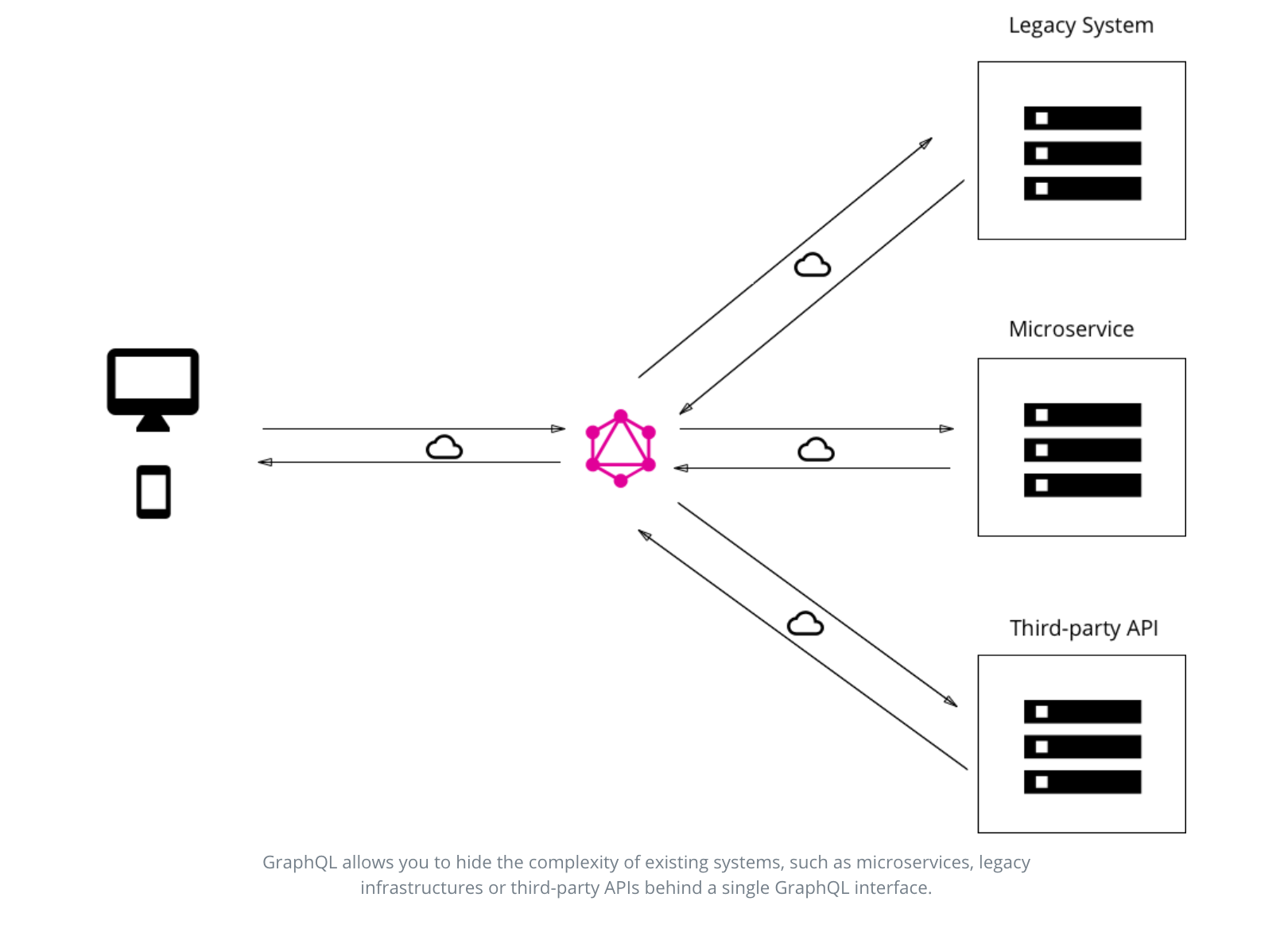 基本上,它意味着下面的体系结构。GraphQL API是位于各种API之上的网关,如传统的Soap、、第三部分API、数据库或blalablab。