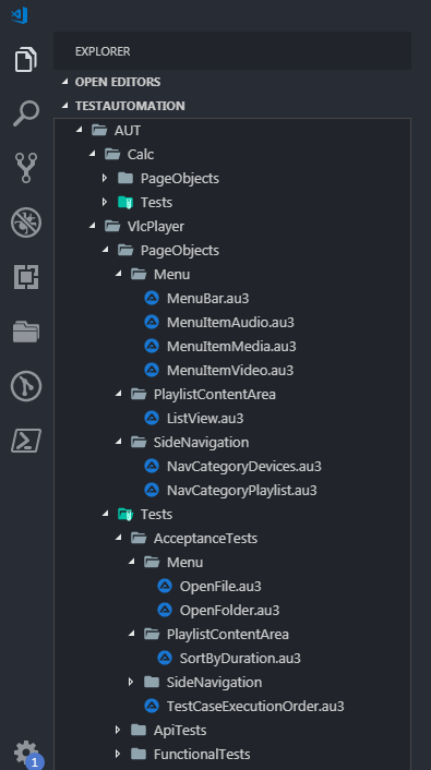 该结构由测试Calc和VlcPlayer两个应用程序组成。两者都遵循共同的结构PageObjects和测试。您应该尝试在许多子文件夹中对页面对象(文件)进行分离,以保持概述。这个子结构应该类似于测试文件夹/子文件夹。