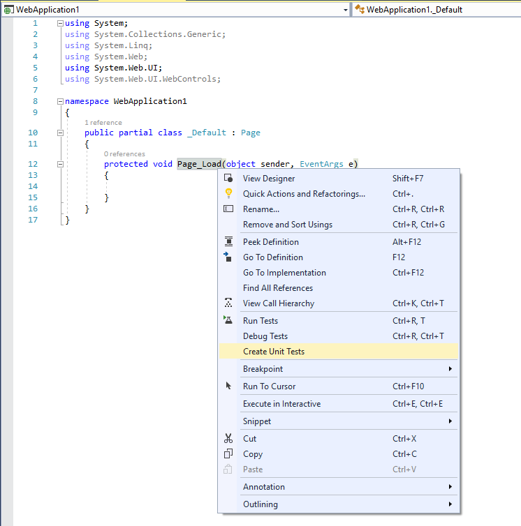 VisualStudio2017 for VB.NET中缺少"Create“上下文菜单选项,但C#可用。