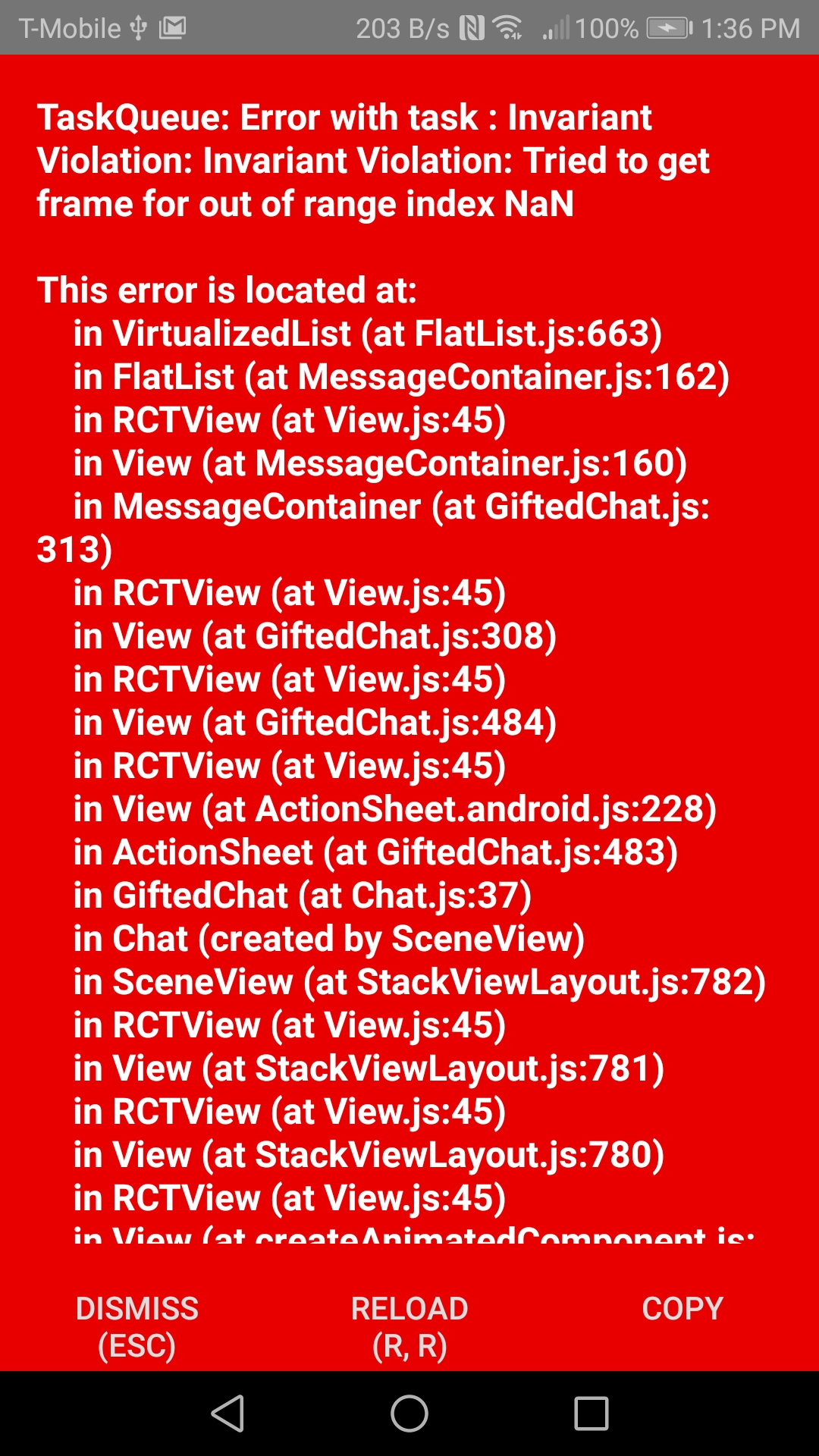 "react-navigation": "^3.0.9"有一些关于不同情况下的错误的在线帖子。该错误指向GiftedChat中的Chat.js。我不知道是什么导致了这个错误。