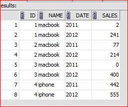 select 1 as id, 'macbook' as name, 2 as "2011", 241 as "2012" from dual union