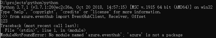 因此,如果在实际的azure.py包之前有一个名为azure的Python脚本,那么您将得到问题ModuleNotFoundError: No module named 'azure.eventhub'; 'azure' is not a package。