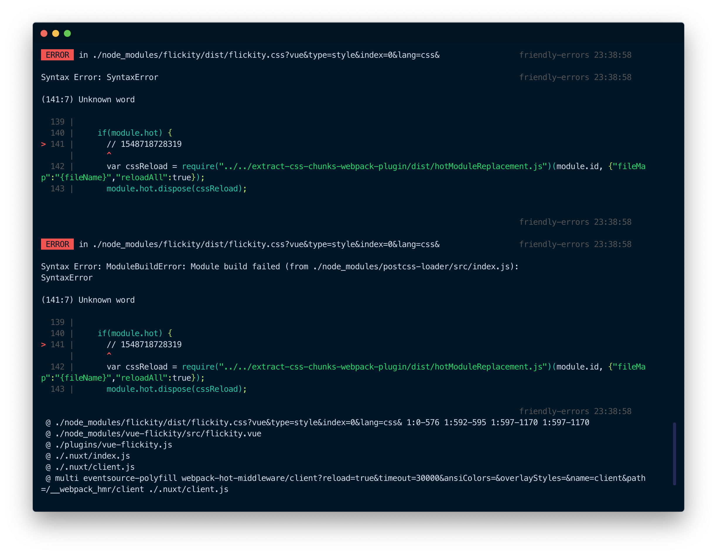 ./node_modules/flickity/dist/flickity.css?vue&type=style&index=0&lang=css&友好中的错误-错误16:00:12 语法错误: ModuleBuildError:模块构建失败(来自./node_ SyntaxError /postcss-加载程序/src/index.js):友好-错误16:00:12 SyntaxError (141:7)未知词 139 - 140 -如果(module.hot){ [ 141 ]\/ 1548777611244 \x{ require("../../extract-css-chunks-webpack-plugin/dist/hotModuleReplacement.js")(module.id,{"fileMap":"{fileName}",“reloadAll”:真}); module.hot.dispose(cssReload);>友好-错误16:00:12 @ ./node_modules/flickity/dist/flickity.css?vue&type=style&index=0&lang=css& 1:0-576 1:592-595 1:597-1170 1:597-1170 @/node_node/vue-flickity/src/flickity.vue@./plugins/vue-flickity.js @./..nuxt/index.js@.