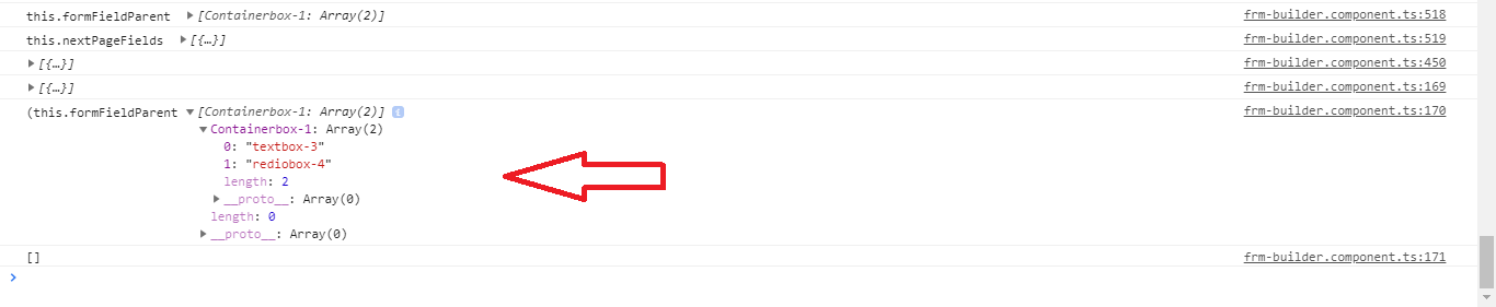 this.formFieldParent[targetId].push(idNm); <-- adding values here for key当我对其进行控制台时,输出如上面所示,并通过使用[]返回JSON.stringify(this.formFieldParent);