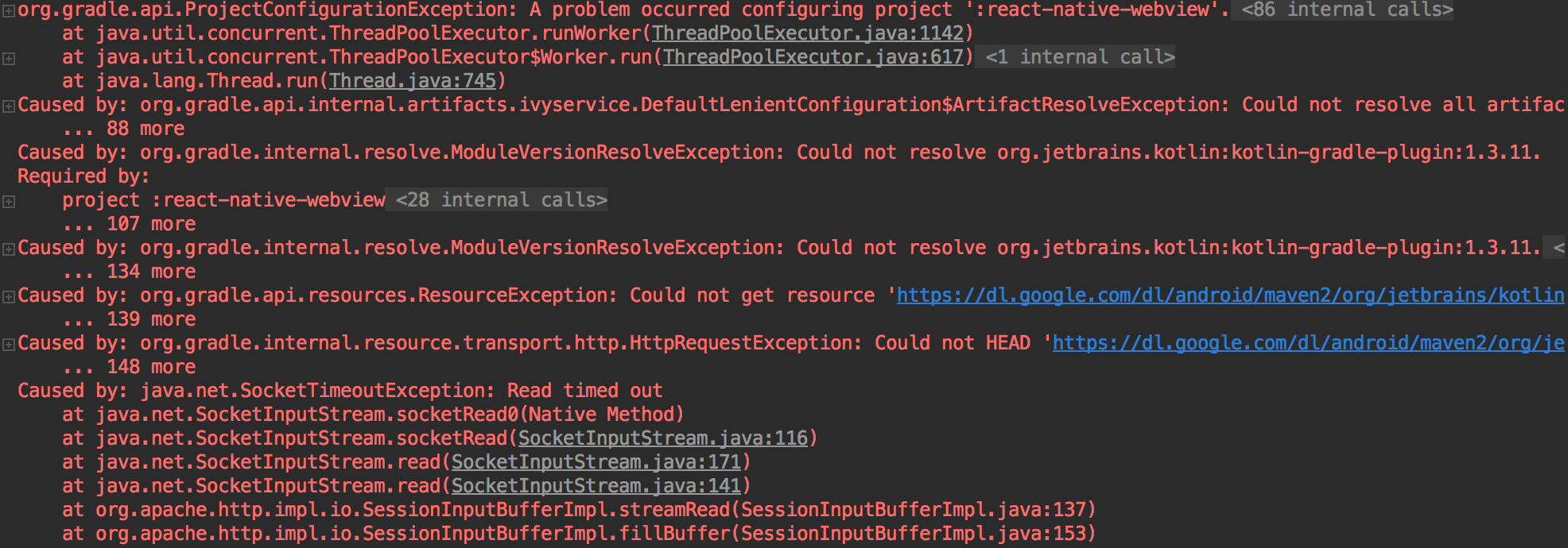 yarn install react-native-webview。// 4.1.0版react-native run-android请注意,版本1.3.20也有。https://jcenter.bintray.com/org/jetbrains/kotlin/kotlin-gradle-plugin/1.3.20/kotlin-gradle-plugin-1.3.20.pom