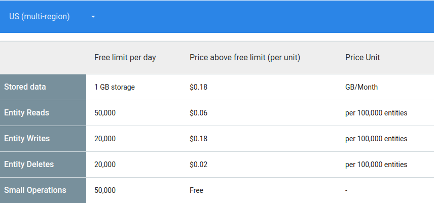 您可以查看Datastore 这里的定价细节。以下是截至2019-02-01年美国多区域使用的价格: