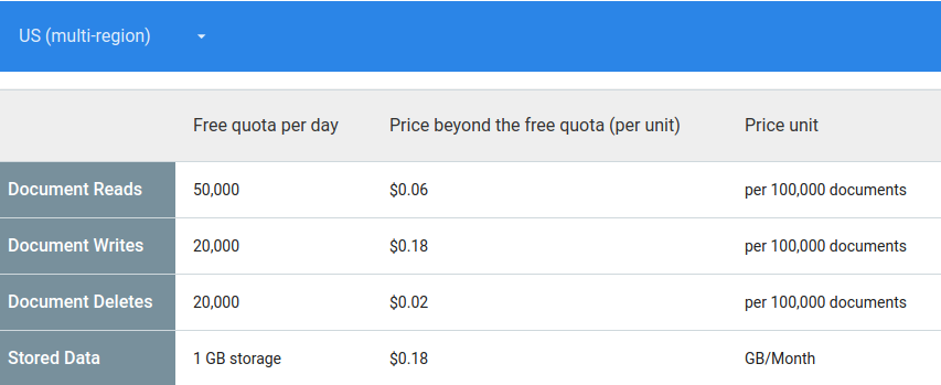 可以在这里中找到Firestore价格的细节。截至2019-02-01年,美国多区域使用的价格为: