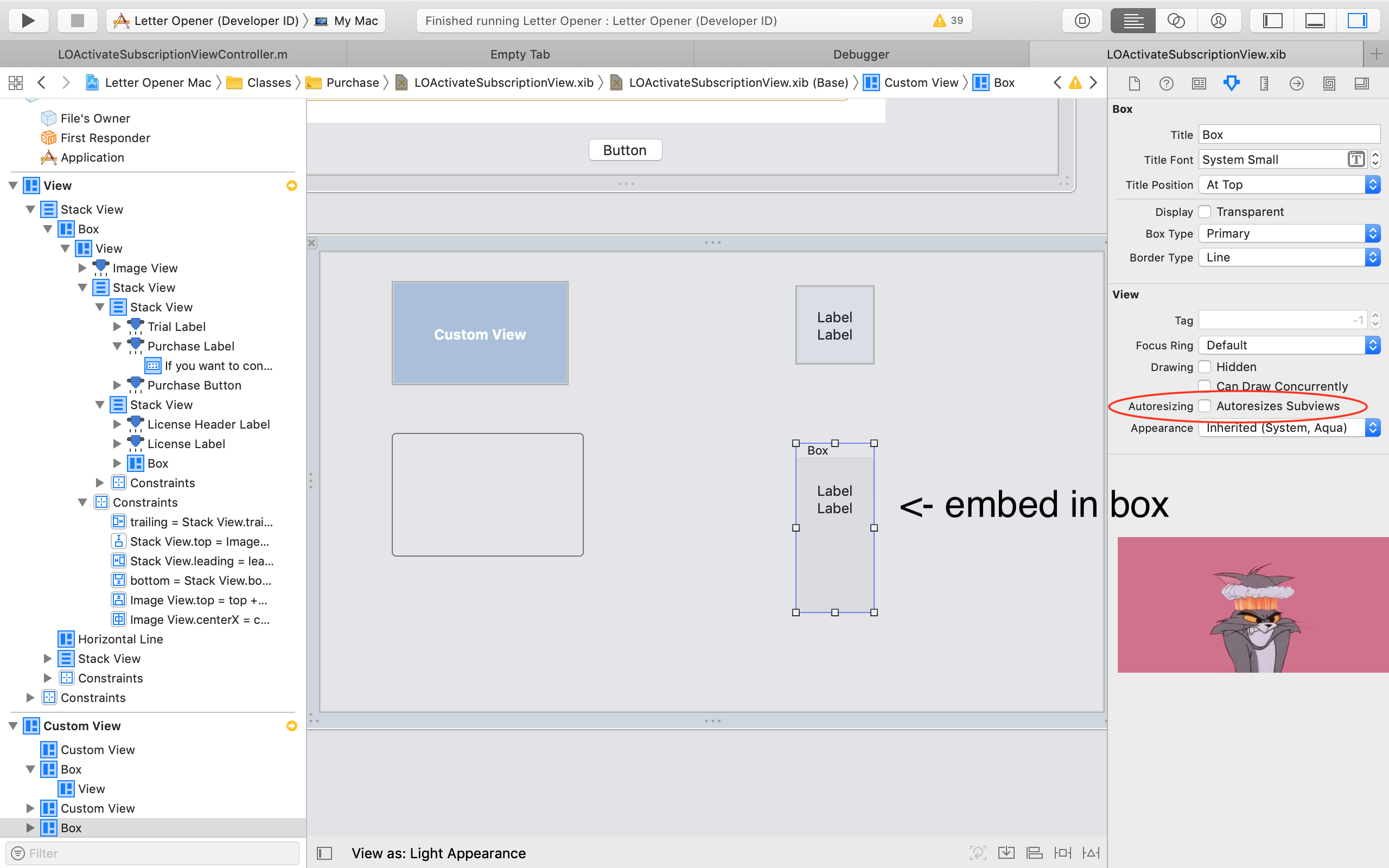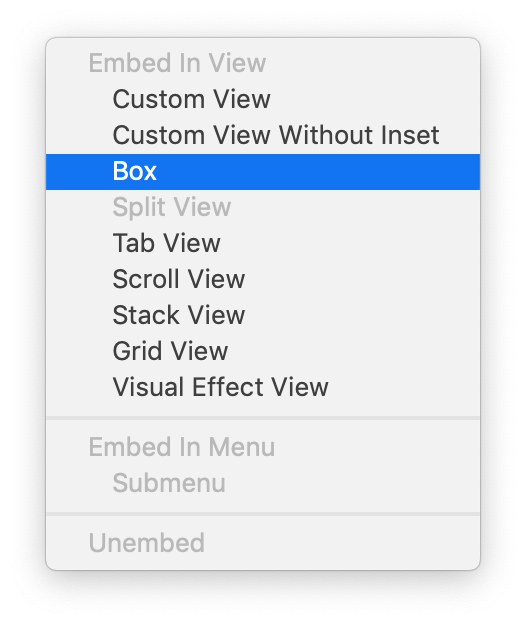 当使用Interface > Editor > Embed In > Box时,会出现一个错误。NSBox autoresizesSubviews属性设置为NO,而不是YES。