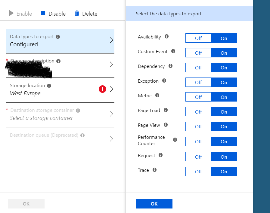 在查询资源管理器中的ApplicationInsights分析中,有一个名为traces的表,其中包含在c#代码中调用TrackTrace时创建的遥测数据。我们设置了一个连续导出到blob存储,但我们找不到跟踪数据。在存储帐户中,只有6个虚拟目录,但是查询资源管理器中有更多的表。是否有关于如何将表映射到目录的文档?