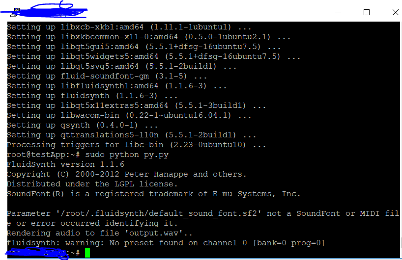 我相信,在linux上安装fluidsynth之后,您的windows解决方案将在Windows上安装fluidsynth之后得到解决。
