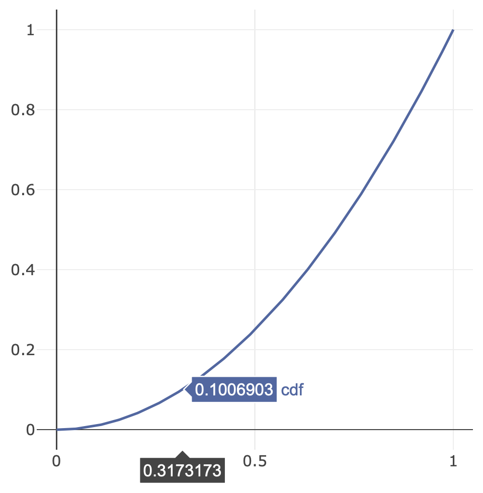 这里是x^2的CDF的可视化(对于二维),[0,1]中随机生成的数字将映射到这条曲线上的相应x坐标。(例如.1➞.317)