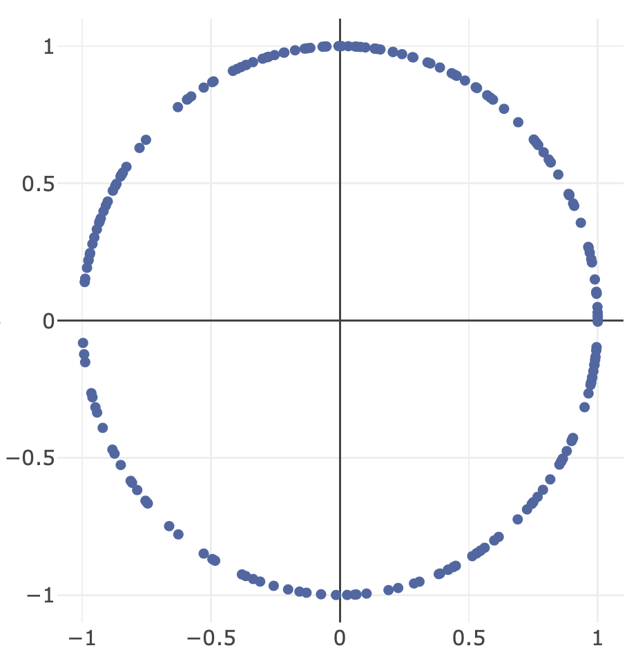 为了达到(1),我们可以随机生成一个向量,由d独立绘制的高斯分布归一化为单位长度。这行得通是因为高斯分布有一个概率分布函数( x^2 ),它以指数形式存在。这意味着联合分布(对于独立的随机变量,这是它们的PDF的乘积)将在指数中有(x_1^2 + x_2^2 + ... + x_d^2)。注意,这类似于d维中球的定义,这意味着来自高斯分布的d独立样本的联合分布对旋转是不变的(矢量在球面上是一致的)。