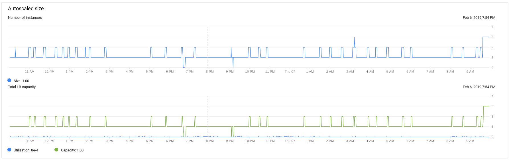 我有一个实例组,它将HAProxy度量报告给StackDriver。此实例被配置为基于该度量自动缩放。每个实例的容量为300。