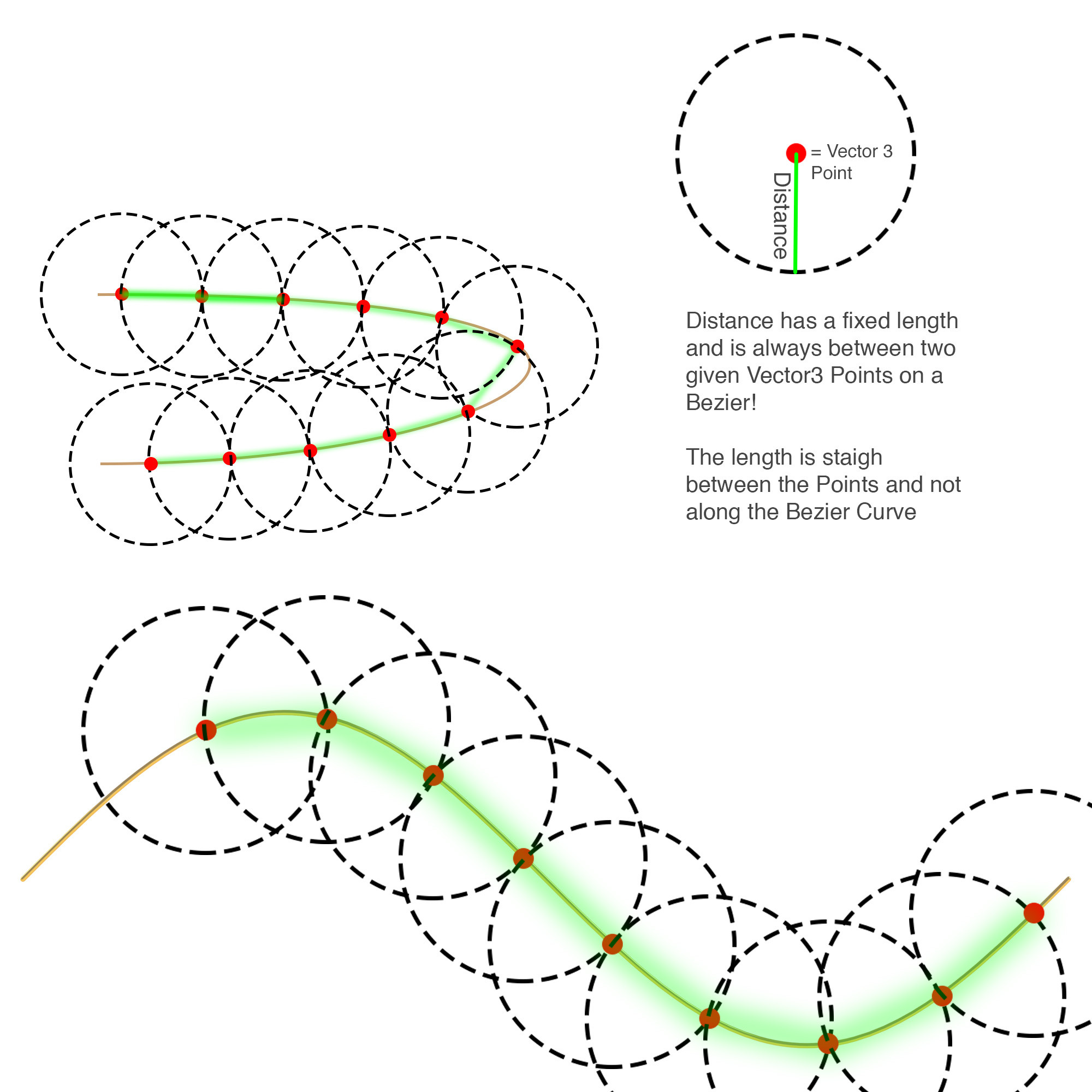我想要实现,我可以细分一个贝塞尔曲线与给定的距离。如果Bezier是一条直线,那么它可以工作,但是如果我改变一个控制点(B&C),使Bezier得到曲线,计算出的点之间的距离不再像给定的距离!