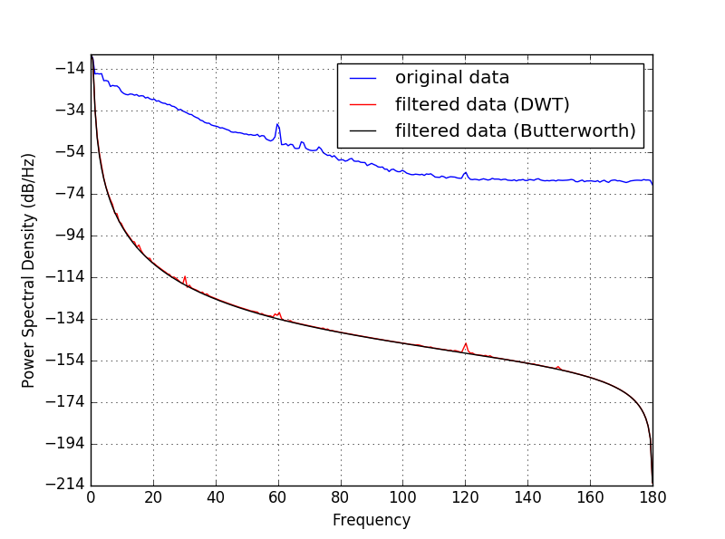 filtered_data_butterworth = signal.filtfilt(b, a, data)让我们用这两种方法绘制原始数据和过滤数据的功率谱密度: