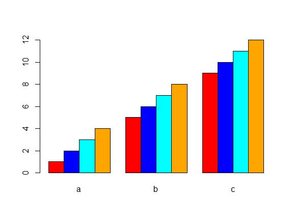 barplot(mat,col = c("red", "blue", "cyan", "orange"), beside = TRUE)
