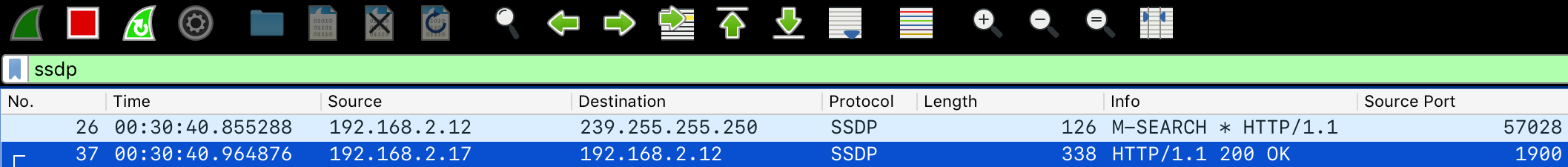 SSDP发现广播被发送,一个UPnP设备回复。(下面是Wireshark截图)