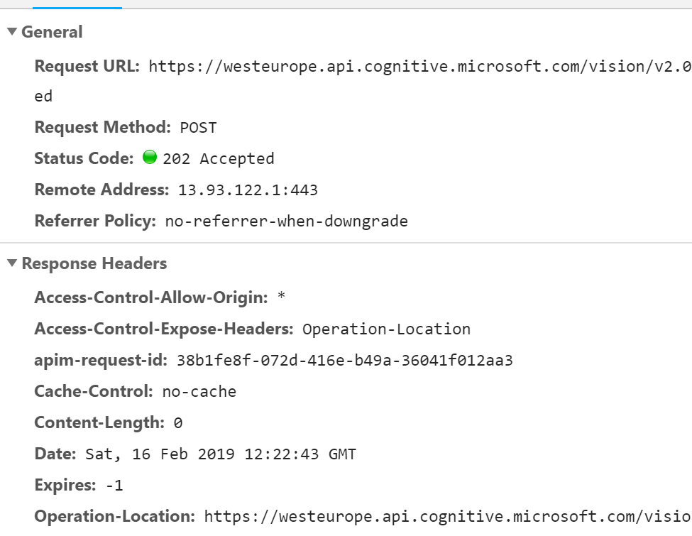 Azure文档说:“服务已经接受了请求,稍后将开始处理。它将立即返回接受,并包含一个”操作位置“头。客户端应使用此标头中指定的URL进一步查询操作状态。操作ID将在48小时内过期。”