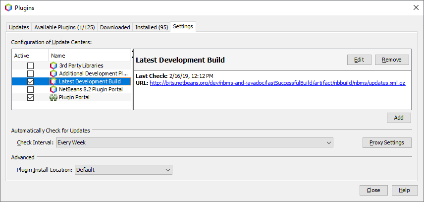 但是,我似乎找不到/访问这个插件。在“设置”中,我激活了NetBeans8.2插件门户,但是我仍然(在更新后)只安装了31个可用插件和9个插件。