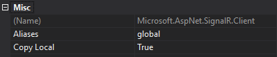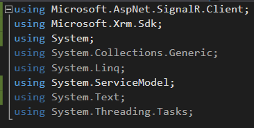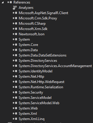 我已经创建了一个插件,它会在我的虚拟实体的Post创建中触发。我有Micrisoft.AspNet.SignalR.Client的参考资料。