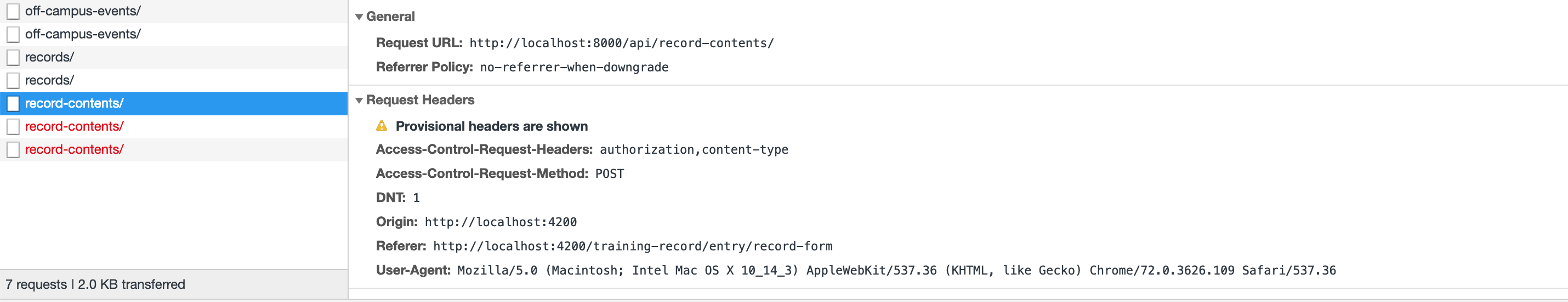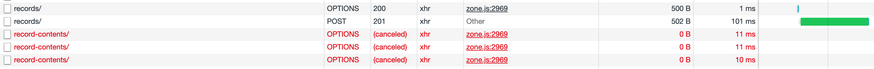 当我试图发送POST请求以在前端创建一些资源(角)时,一些飞行前选项请求由Chrome发送,并由后端服务器(python )成功地响应,而另一些则没有。这些请求由于未知的原因而被取消,后端服务器日志表示服务器接收和接受请求,详情如下图所示。