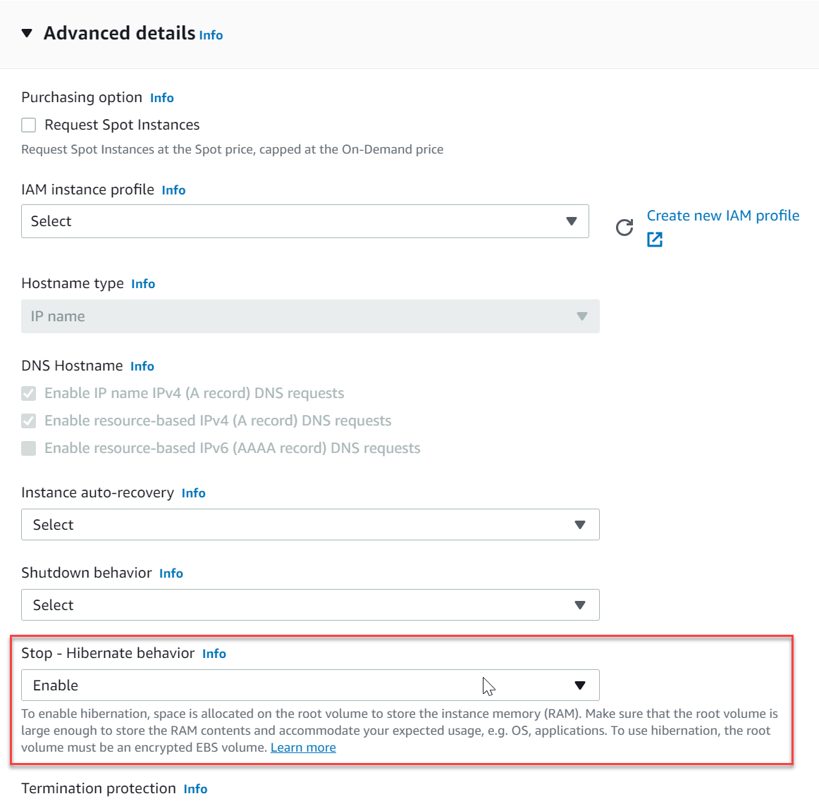 AMIs (在EC2 AWS控制台中)启动新的AMIEnable hibernation as an additional stop behavior为了测试它: