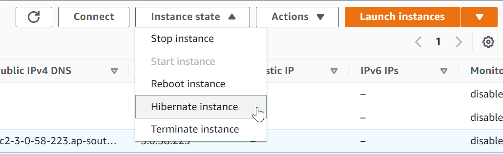 若要使创建的实例休眠,请从仪表板中选择它,选择实例状态 -> Hibernate实例。
