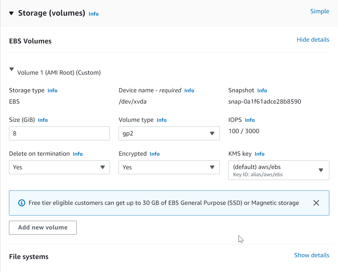 在启动实例向导(创建新EC2实例时的向导)中,展开存储(卷)和EBS卷部分