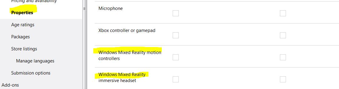 你可能意外地启用了(检查)它们。因此,打开最后提交或更新提交,单击Properties >>向下滚动到系统requirements >>,然后取消选中Windows混合现实运动控制器& Windows混合现实沉浸式耳机,如果应用程序不需要这些项目。