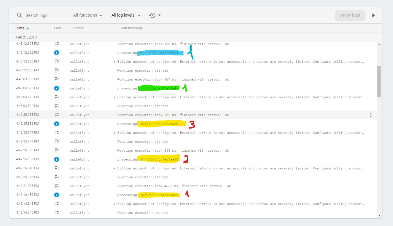 下面是我的函数代码,在该代码中,我将使用processed: true标记任何已处理的事务,以便下次触发时可以忽略它。正如您在日志中看到的那样,processed_already消息永远不会弹出,这意味着触发器将不会在下次触发时获取新数据。