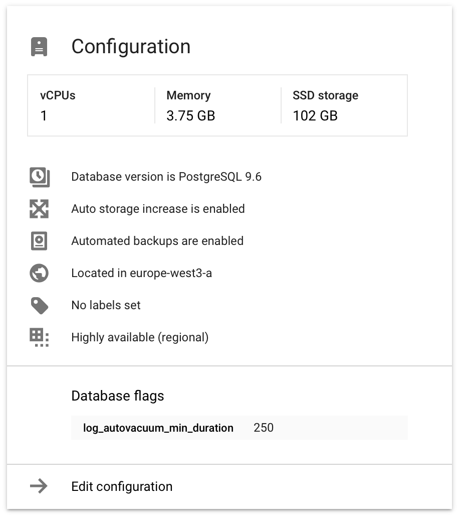 我们的Postgres (托管在上,有1CPU,3.7GB RAM,见下文),主要由一个大~90 GB的表组成,大约有6,000万行。使用模式几乎完全由附加和几个索引读取表的末尾。偶尔会有几个用户被删除,删除分散在表中的一小部分行。