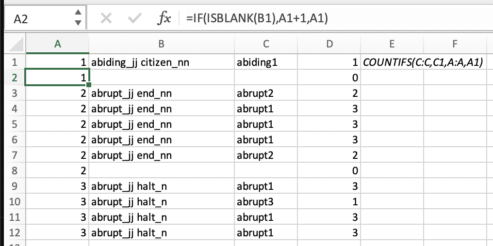 | abiding_jj citizen_nn | (abiding1) | 1[=COUNTIF(B$1:B$1,B1)]