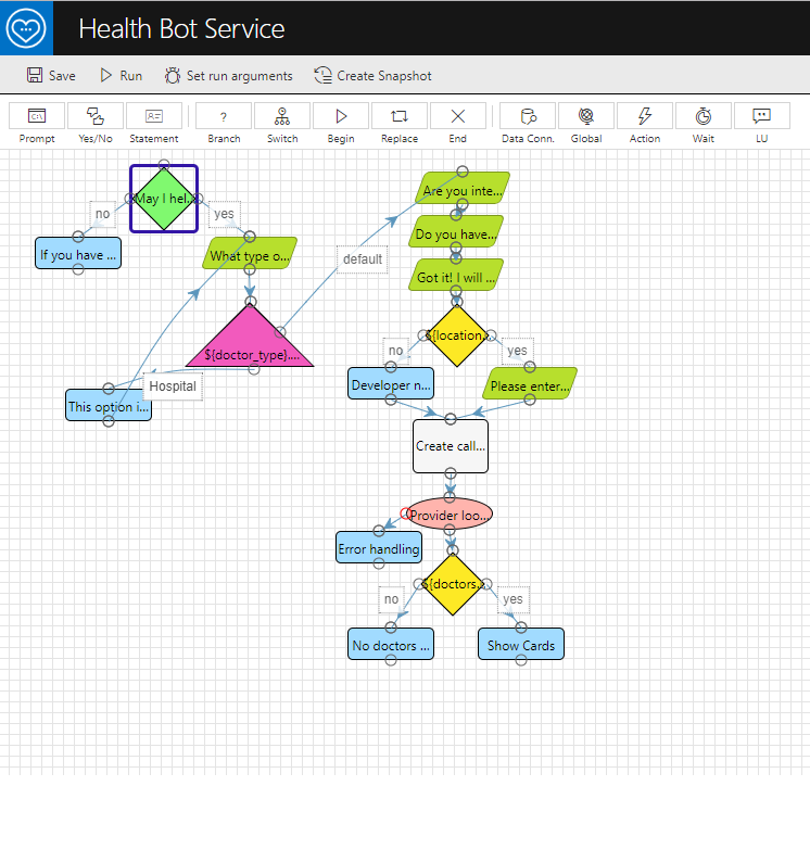 您可以通过方案设计器在Healthcare Bot中自定义预构建的方案。在您创建的保健机器人服务中,单击“管理帐户”。如果没有配置任何方案,请选择模板方案或创建新的空白方案。否则,单击方案名称以打开设计器。在这里,您可以根据需要自定义场景,方法是从顶部窗格中添加更多的场景元素,或者在场景中修改元素。