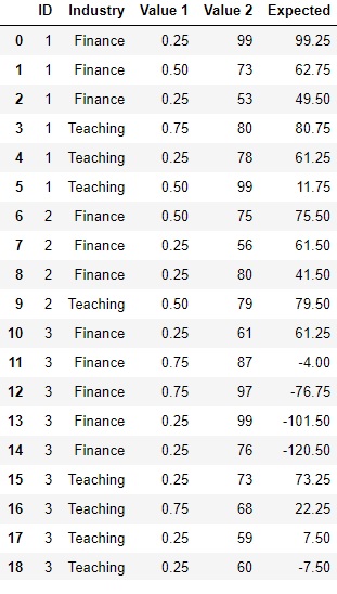 18 3 Teaching 0.25 60我想按ID和工业进行分组,我想创建一个新的字段,名为"Expected“。预期将等于: