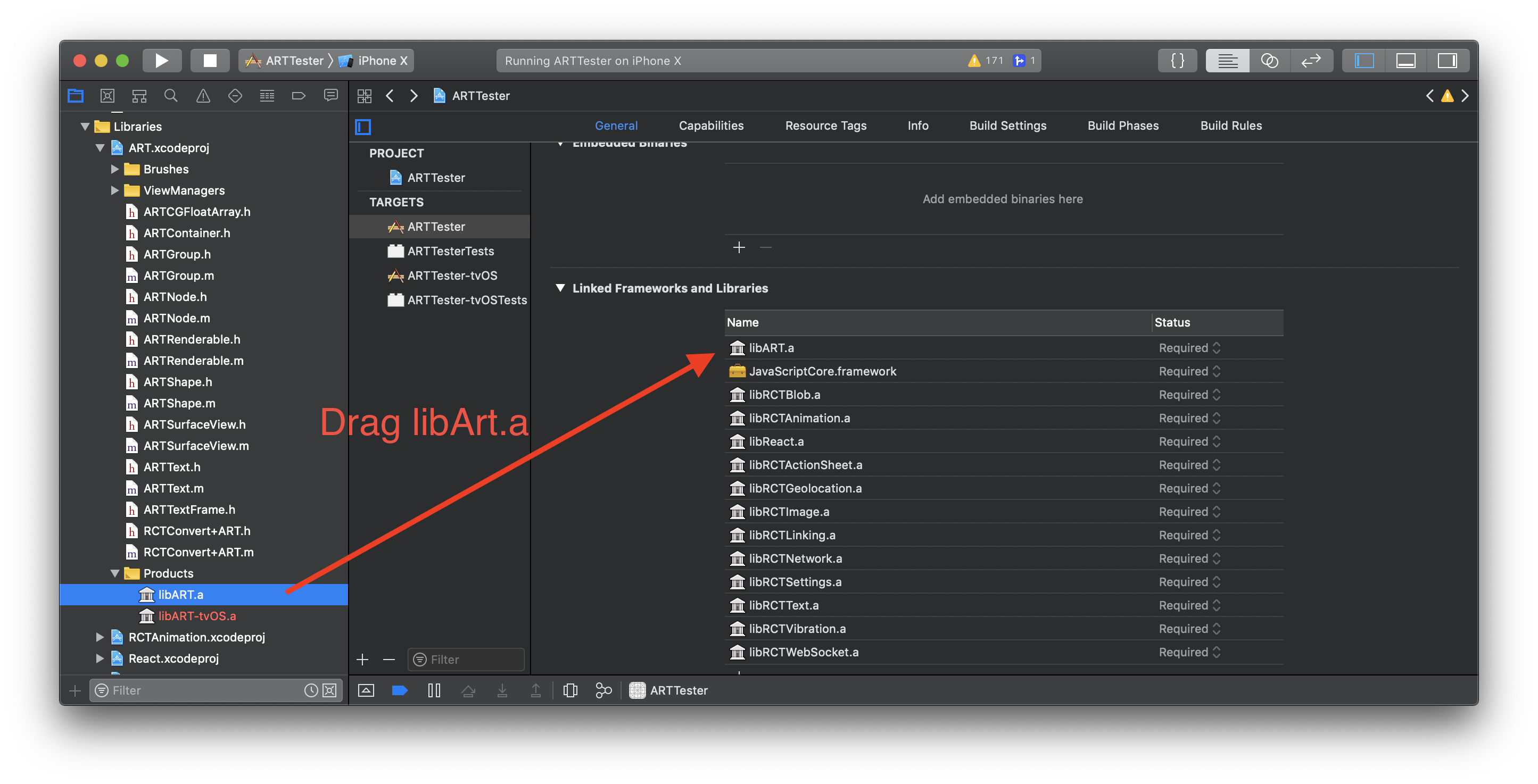 然后,您需要将libArt.a从Art.xcodeproj中的products文件夹拖到链接框架和库中。