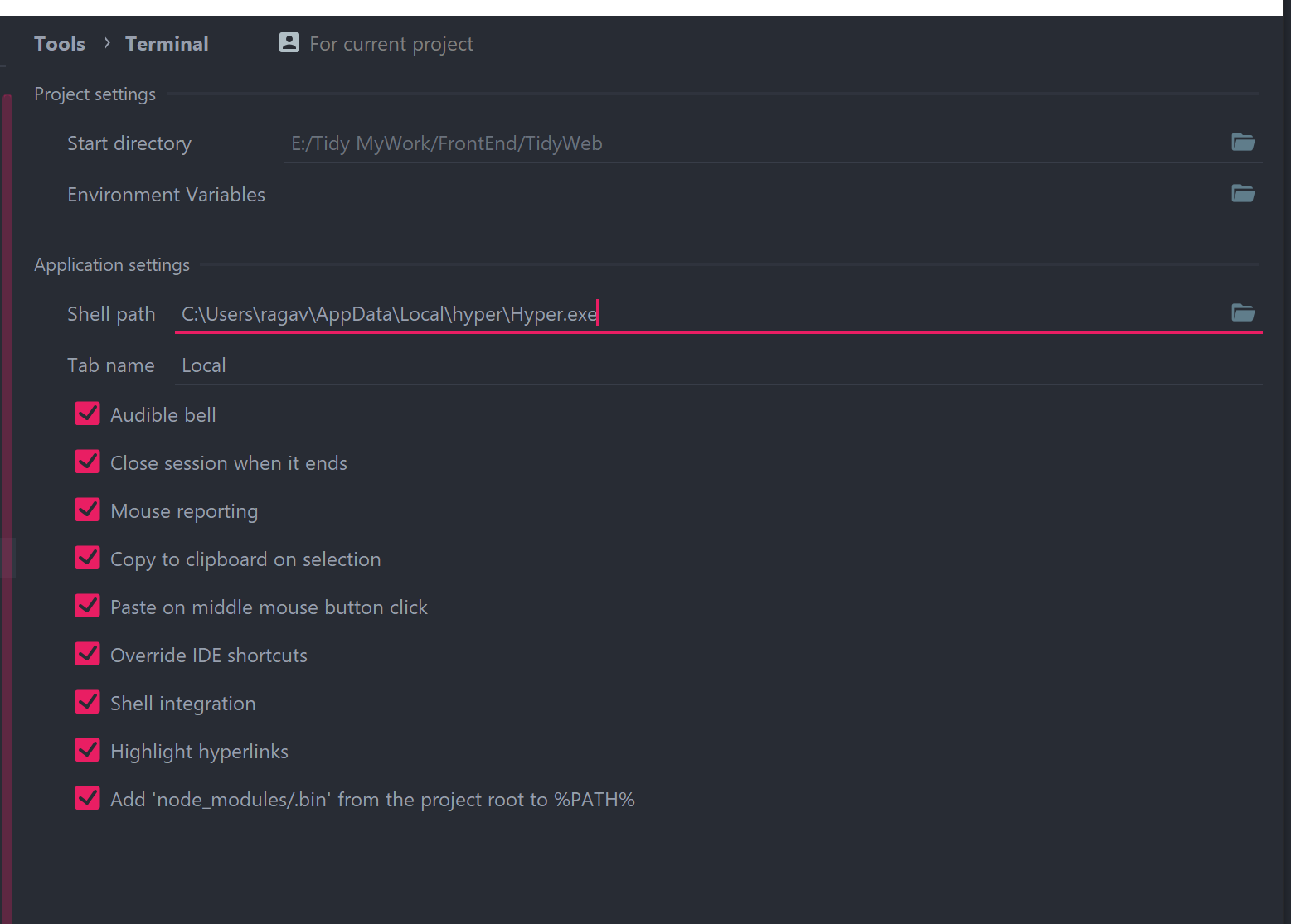 我正试图在WebStorm中集成Hyperterm。即使我指定了有效路径。然后Hypeterm在一个新的例子中打开。有没有人知道如何在WebStorm内部对接。