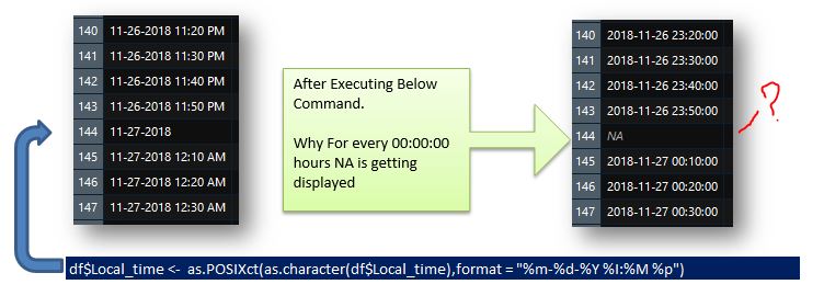 我试图将AM/PM格式的日期和时间转换为as.posixct,但是每到00:00,我就得到NA。请给我带路。请参阅下图。