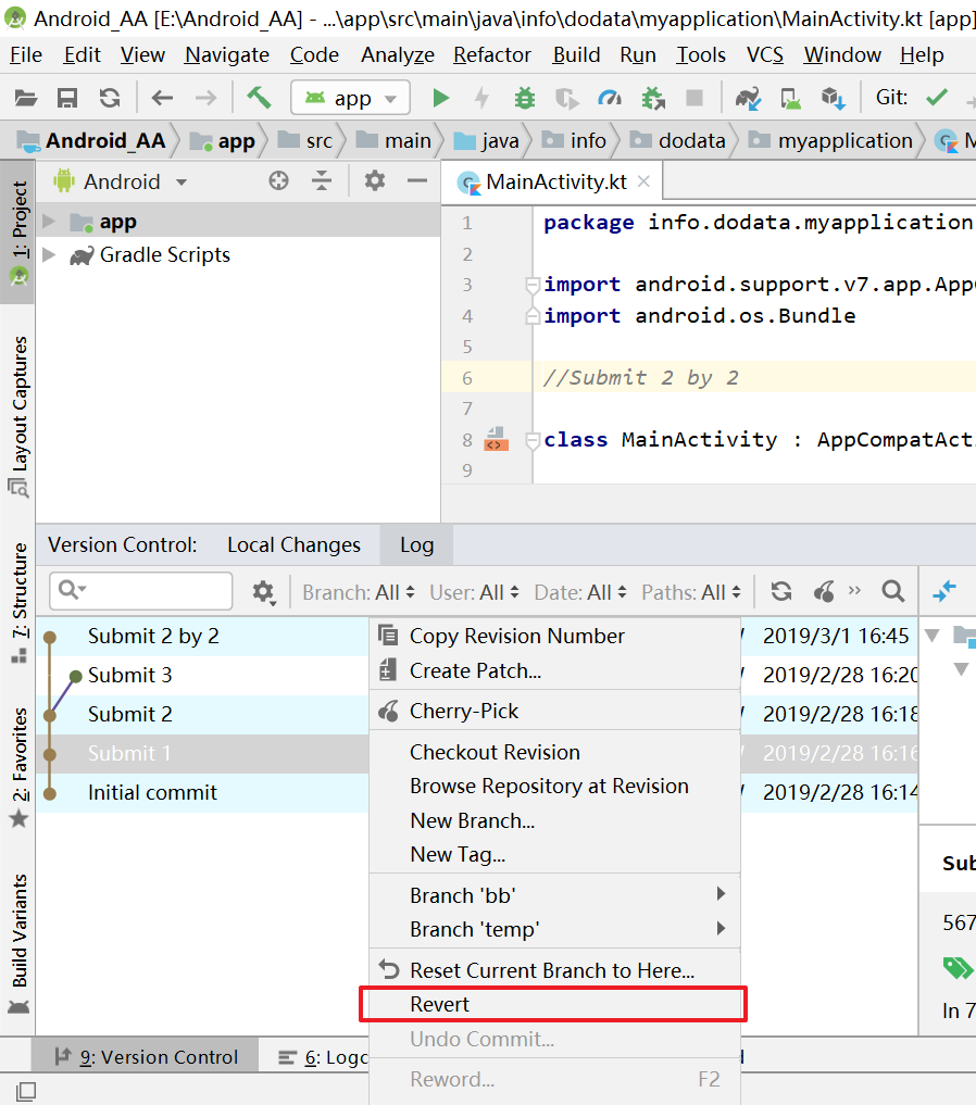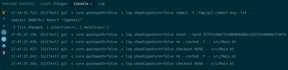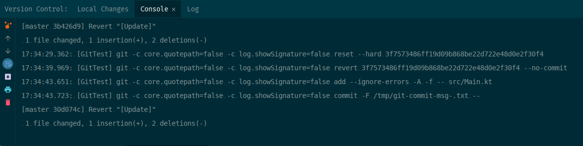 - Conclusion: `Version Control` -> `Log` -> `Revert` = `git revert` (+ `git add` + `git commit`, optional ) = Edit the repository like before the commit it is reverted to.