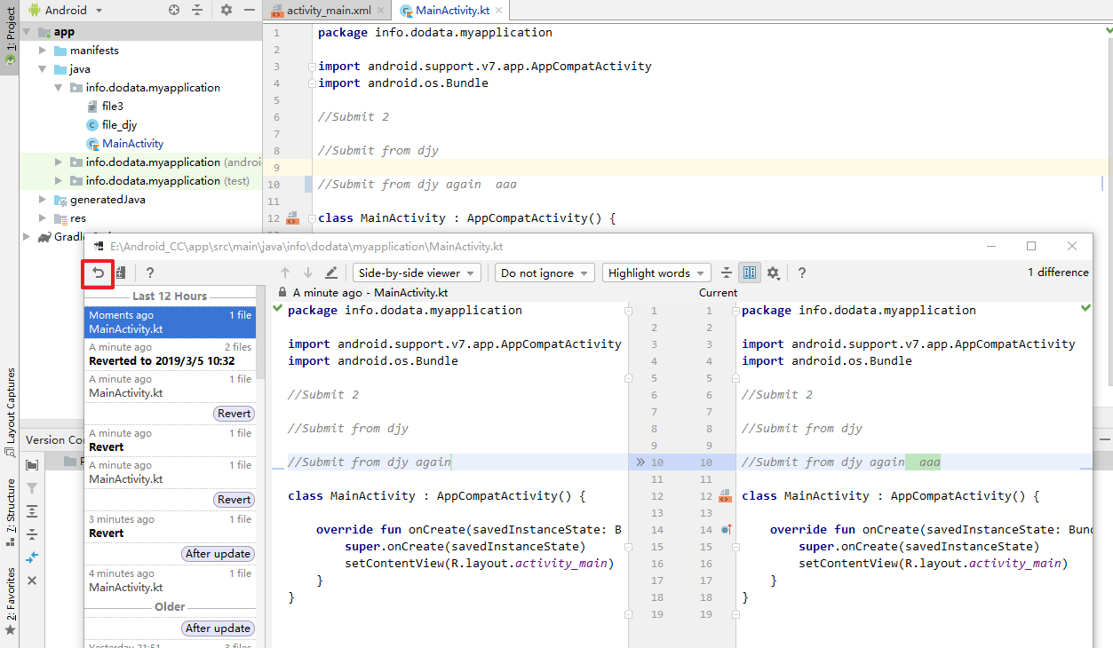 Local History -> Show History 是由IntelliJ IDEA管理的独立内置VCS。 (以及其他JetBrains IDE,包括从IntelliJ IDEA社区获得补丁的Android ),它与Git或其他类型的VCS没有任何关系,如果您执行File -> Invalidate Caches / Restart -> Invalidate,它将被清除。该Revert的作用类似于Version Control -> Log -> Revert,两者都将源恢复到历史记录。发布于 2019-03-03 14:38:39