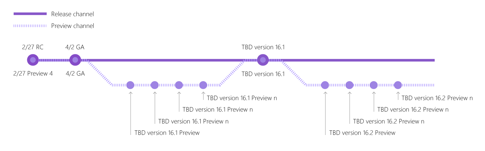 2018年12月4日发布了VisualStudio2019预览1。在2019年2月27日,他们发布了预览4和同时VisualStudio2019RC。我假设在释放RC时,它们会停止预览分支,但现在它们是成对发布的(Preview 4.1 & RC.1,Preview 4.1.Svc 1& RC.1 Svc1)。现将预览的发行说明重定向至RC (即"Visual 2019预览4.1是对Preview 4的维护更新,包含与Visual 2019 RC.1发行版相同的功能“)。