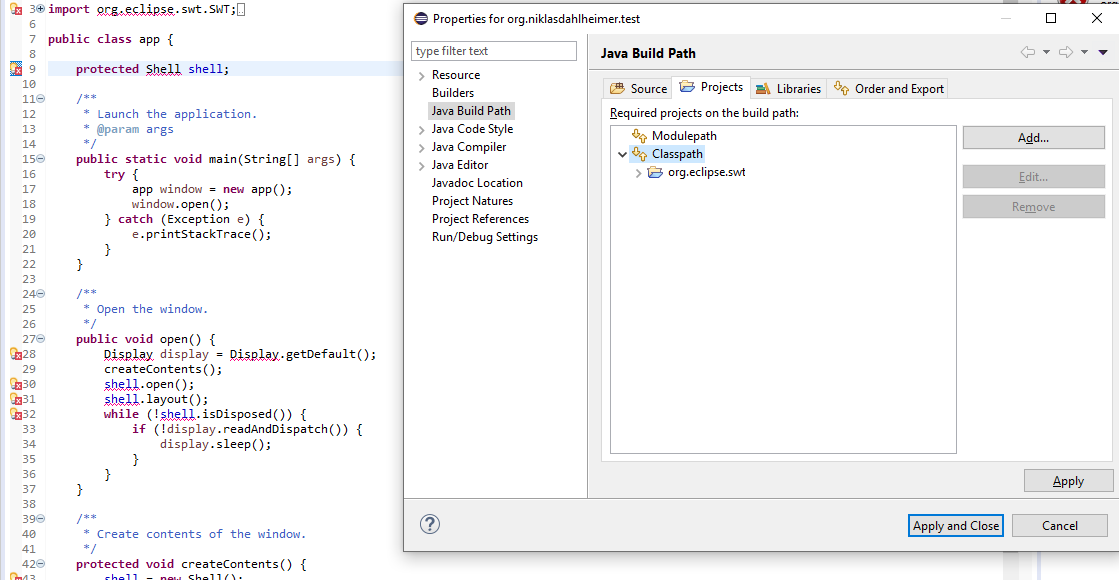 但是testwindow.java中的导入语句仍然显示“导入org.eclipse无法解析”。