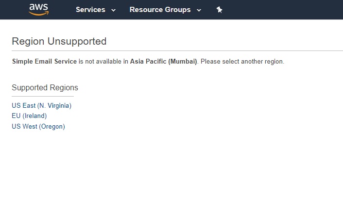 Simple Email Service在亚太(孟买)中不可用。请选择另一个区域。