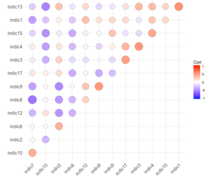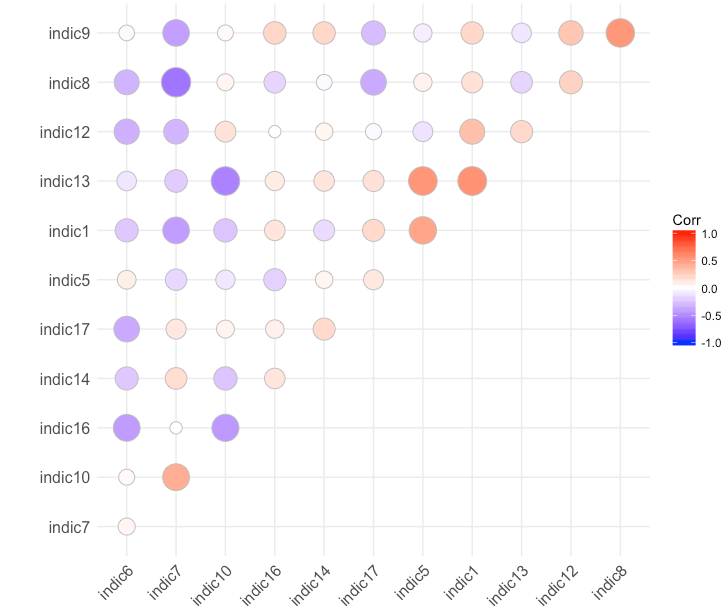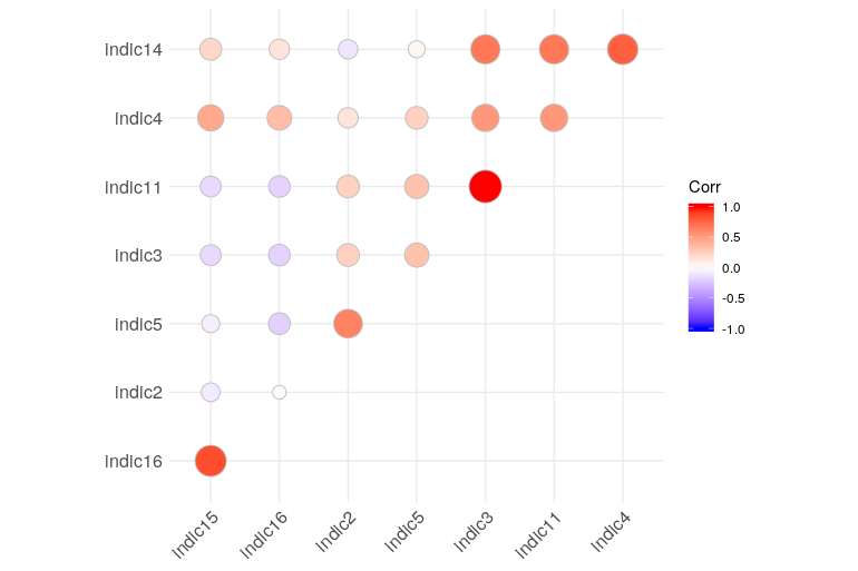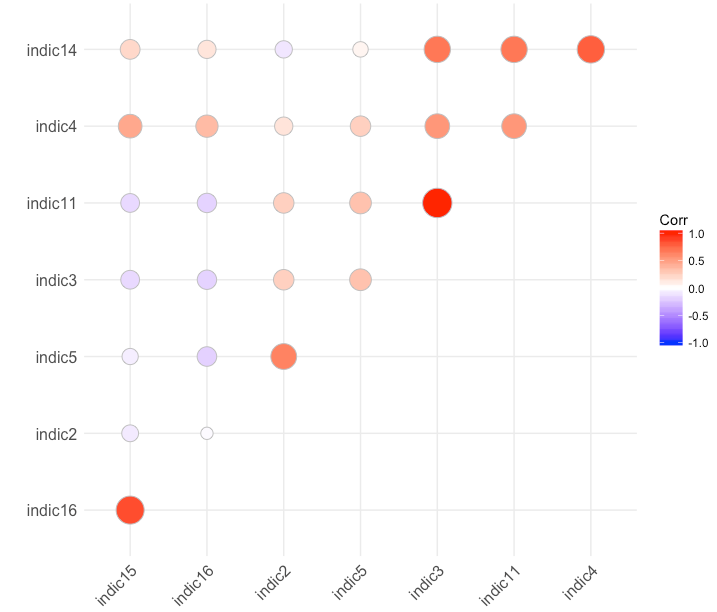 我的目标是建立一个综合指标。在进行加权和聚合规则(如经合组织综合指标编制手册中所描述的)之前,一个重要步骤是查看指标之间的相关性。