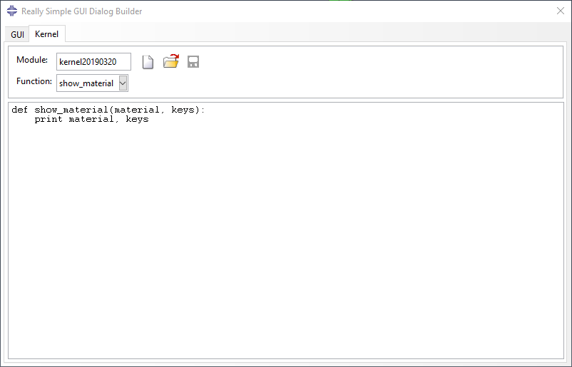 这一点很重要,因为它显示了在您的函数中必须接受哪些关键字!您可以看到,我已经定义了我的内核函数来接受materials和keys,因此不需要进一步的步骤,我可以通过在测试模式中禁用Show对话框来测试插件。