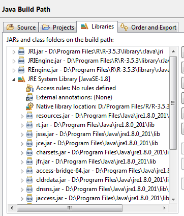 EDIT2:此外,我现在已经按照推荐的here将所有.DLL文件从D:\Program Files\R\R-3.5.3\bin\x64和jri.dll复制到D:\Program Files\Java\jdk1.8.0_201\bin。还是没有运气。