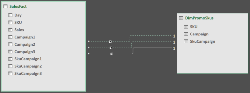 USERELATIONSHIP(SalesFact[SkuCampaign1], DimPromoSkus[SkuCampaign])