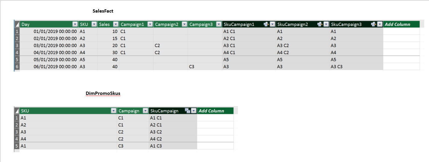 因此,基本上,DimPromoSkus表的目标是指示产品是在C1、C2还是C3中。例如,活动C1发生在2019/1/2019至4/1/2019天之间,但只有SKUS、A1和A2在促销上出售。A2和A3不做广告,但在竞选C1期间出售。