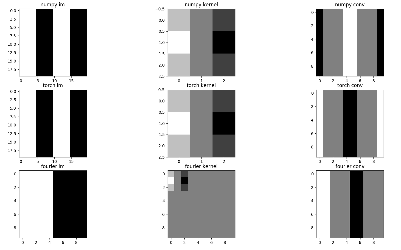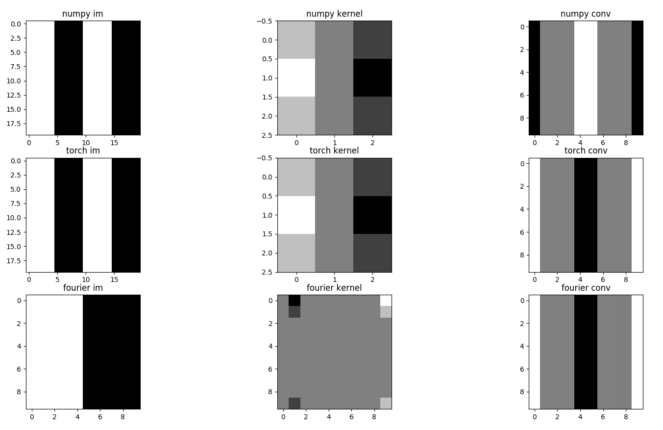 注意:两个numpy__and torch版本的图像都显示周期图像,这是执行周期卷积所必需的。Fourier版本的内核显示原始内核零填充到图像大小,这是计算频域元素方向乘法所必需的。